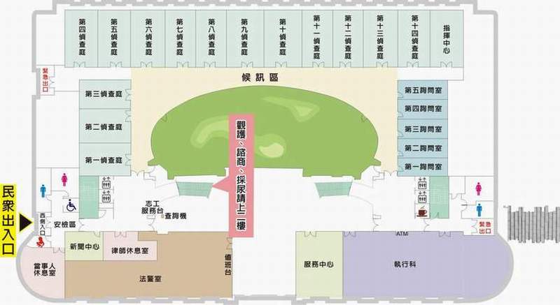 本署一樓介紹法警室,服務中心,第1至14偵查庭,第1至5詢問室,執行科,法警室,當事人休息室,律師休息室(閱卷室),新聞中心