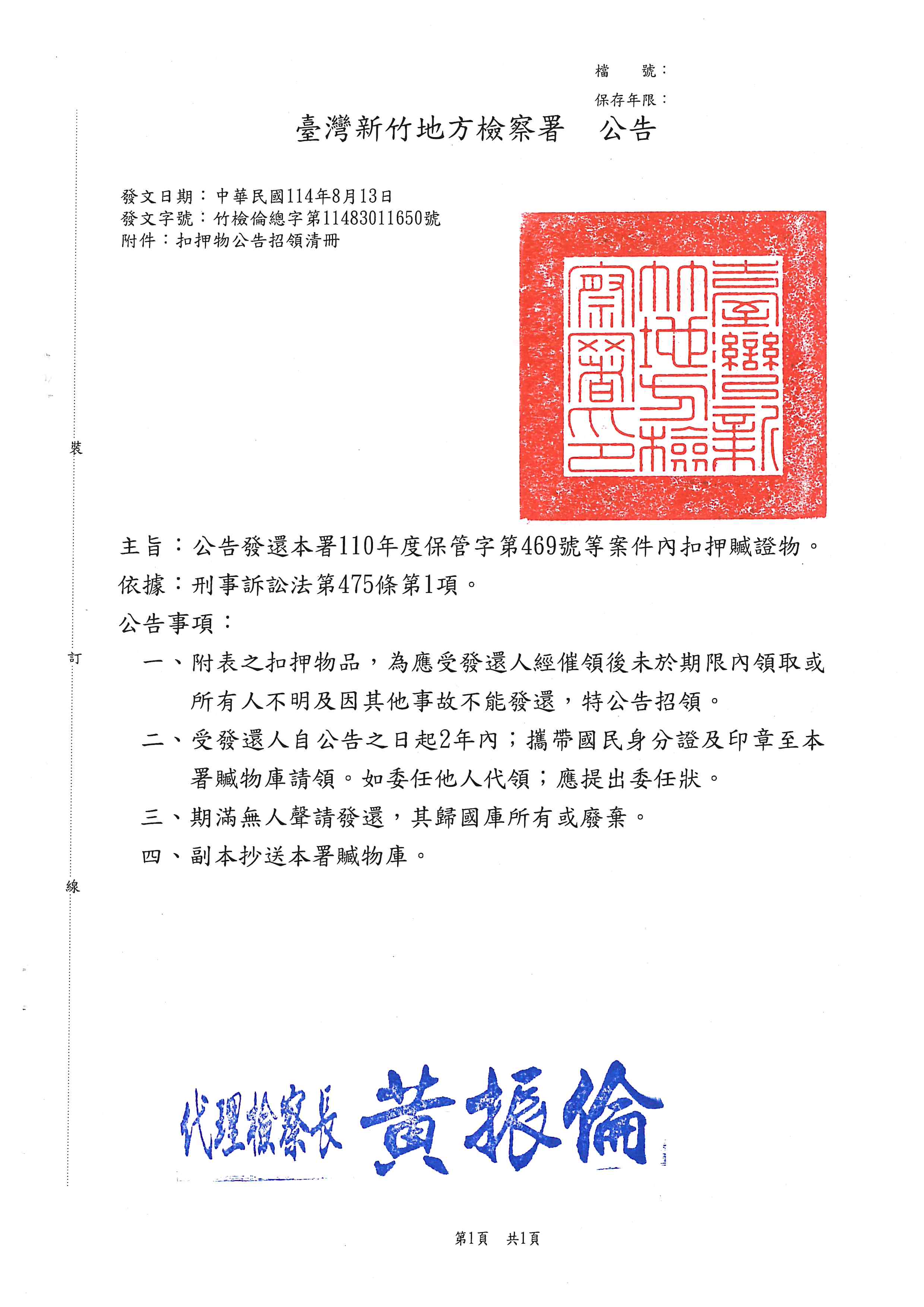 主旨:公告發還本署110年度保管字第469號等案件內扣押贓證物。